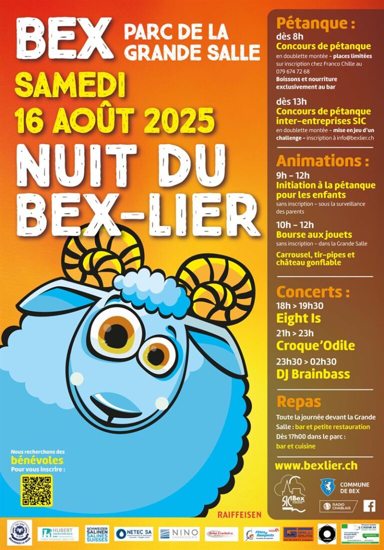 Le samedi 16 août 2025, la 53ème Nuit du Bex-Lier vous attend de 8h00 à 2h30 du matin, avec au programme: Animations, Pétanque et Concerts